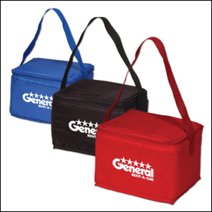 GL3006: 6-Pack cooler. Made with 425 denier polyester fabric. Colors available: royal blue, black, red. Weight: 50 pcs/ 15 lbs. Product size: 8"W x 6"H x 5-1/2". Imprint area: 5"W x 3"H. Imprint method: Silk screen printing Set up: $50.00, all prices include 1 color/ 1 position printing. Production time: 2 weeks