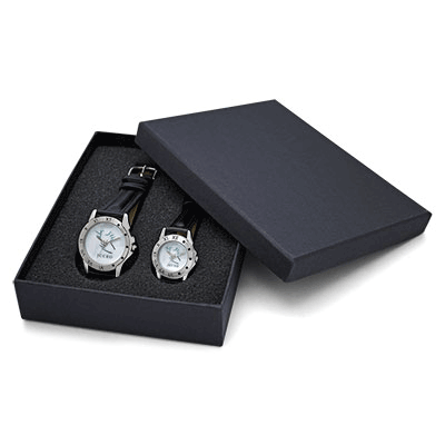 GP007: Imagine the long lasting impression this watch set can create. Use these eye catching timepieces to enhance your promotion campaign or as gift in your exciting celebration or reunion party. Use them to promote your company names, organization membership, products & services 24 hours a day Non-Stop. Beautifully presented in a sturdy custom made gift box, these man & lady silver watches are designed with chrome bezel crafted with Roman numerals & 5 square dices, genuine leather straps, Japanese quartz movement, long-lasting battery, and luminous sweep watch hands. USA printing & assembly. Give this beautiful watch away as a thank you gift to your valuable customers or for employee motivation, they are going to treasure it. Product Sizes/ Imprint Areas: Man Size: 0.98” dia. Lady Size: 0.69” dia.Gift Box Size: 6.6" x 5.2" x 1.5" Imprint methods: *Free digital color image, production time: 2 weeks. *Silk screen printing, set up: $25.00per color per size, production time: 3 weeks.