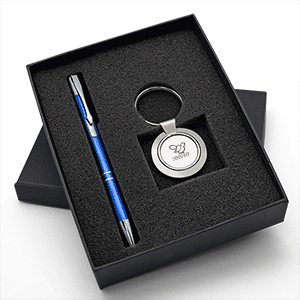 GP024: This beautiful gift set includes a premium metal keychain with mirror-like silver or dark insert & convenient split key ring. Customize it with your company logo/name, web site or phone numbers. Daily exposure provides instant advertising to promote your business. Beautifully presented in a sturdy custom made gift box along with a smooth aluminum pen in the color of your choice. It is a perfect gift for trade conventions, company events, school activities, reality or mortgage companies, insurance businesses, travel agencies etc. Product Sizes/ Colors: Silver key chain: 1.5” dia. Pen: 5.4” x 0.4”; Colors: Black, Burgundy, Royal Blue, Green, Purple, Pink, Silver, Gold. Gift Box Size: 6.6" x 5.2" x 1.5"Imprint Areas: Key Chain: 0.7” dia. Pen: 1.75"W x 0.15"H Imprint Method: Laser engrave: Set up charge $32.00; Re-Set up $25.00. All prices include 1 location engrave. For 2nd location engraving: Set up $32.00, run charge $32.00 per piece. Re-Set up $25.00, run charge $32.00 per piece.